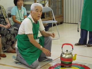 ゲームも子どもたちが加わり、チーム対抗戦。子どもたちも、高齢者の方々と 交流を図りながら、丁寧にゲームのサポートもしていました。やかんを的に向かって投げると会場中に“わぁ~”という声があがり、子ども達も高齢者の方々も一緒になって笑いながらゲームを楽しむことができました。