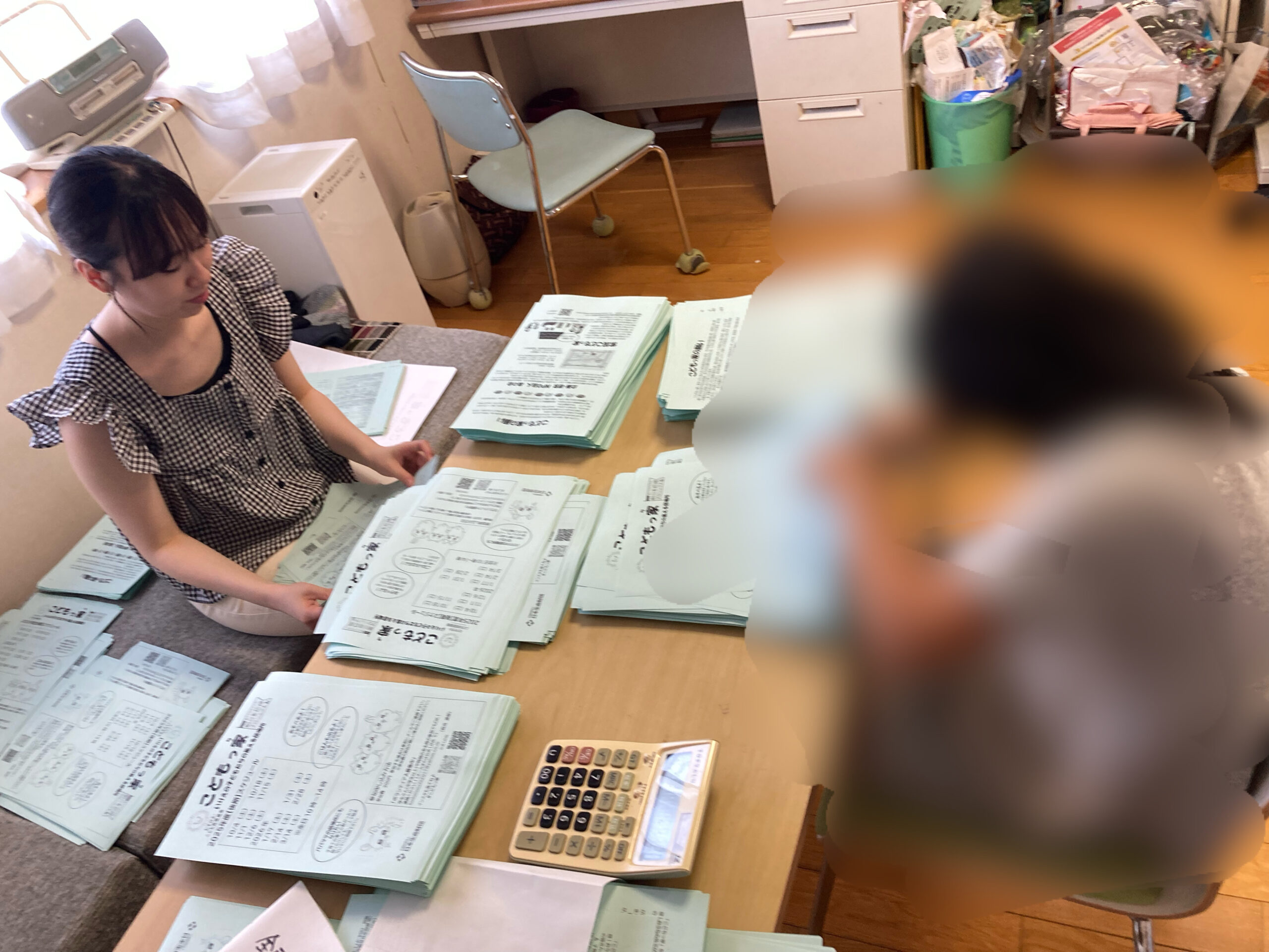 ある日は、チラシ仕分け作業をこどもさんがボランティアの方と一緒に手伝っていたり。