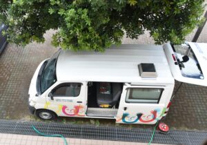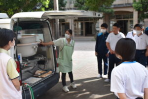 朝8時半。校庭に訪問入浴車両が到着しました。この日の授業は介護福祉コースの生徒さん、総合福祉コースの生徒さんを対象に、午前と午後に分けて行いました。