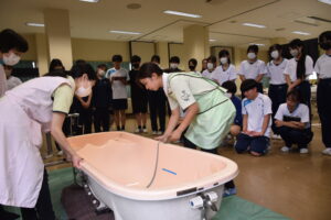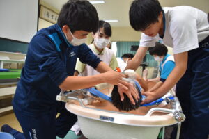 数人ごとのグループに分かれ、利用者役の人・洗髪をする人・体にお湯を掛ける人・足を洗う人に係を分担して行いました。利用者役を体験した生徒さんからは、「みんなに見られて緊張したけど、頭を洗ってもらったり湯船につかったりと、実際の入浴を体験できて良かった」「突然頭にお湯を掛けられたり体を倒されると