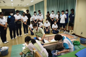 本会の訪問入浴従事者である看護師・介護職が講師となり、訪問入浴サービスの説明をしながら、生徒さん全員に利用者役・介助者役を体験をしていただきました。