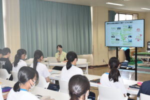 体験前に、まずは座学でしっかり訪問入浴について学んでいただきます。生徒さんの集中力に驚きつつ、本会職員もひとつひとつ丁寧に説明しました。
