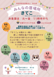 「こどもっ家」の活動拠点の隣の建物では、NPO法人 泉の会さまが、地域の方々のこ食(→孤食・濃食・固食・個食・粉食)を無くしみんなで笑って食べて元気になってほしい!との願いから、日替わりランチ「きてこ」をオープンしています。こども達は、昼食づくりのお手伝いをしたり、「きてこ」に来ている方々と一緒に過ごしたりと、笑顔の輪が広がっていました。
