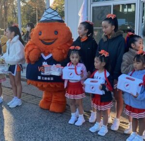 この日は、「VELTEX SHIZUOKA」チームマスコットのベルティくんやVSAチアダンススクールのジュニア&リトルクラスのみなさんが参加し、試合に訪れる観客のみなさんに赤い羽根共同募金へのご協力を元気いっぱいよびかけてくれました!