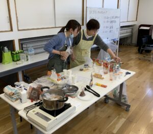 城北学区社会福祉協議会では、今年度の住民向け研修会のテーマとして地域防災を取り上げ、地元の修了生(稲葉さんと中川さん)の2名が講師役として招かれました。プログラムのメインは、災害時の調理法として注目されているパッククッキング。この調理法は、食材や調味料を耐熱性のあるポリ袋に入れて、お湯を沸かした鍋で加熱するもので、洗い物を出さずに簡単に温かい料理を作れます。1月27日の研修会当日、会場に集まった住民約20名は、グループごとに沸騰した鍋を囲み、慣れない手付きながらもこの新たな調理法にチャレンジしていました。メニューは、ごはん、鯖缶カレー、ミネストローネ、蒸しパン、乾物サラダの5品。完成後の試食は、改善点を上げつつも和気あいあいと和やかな場になりました。