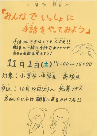 11/1(土)みんなでいっしょに手話をやってみよう 安東児童館 2025年10月22日 こんにちは😊安東児童館です🍁 11月1日(土) 2:00~3:00 福祉教育 「みんなでいっしょに手話をやってみよう」 音が聞こえにくい体験やあいさつ、名前などを簡単な手話を 職員と一緒にやってみよう! 詳しい内容じどうかんだより11月号を見てね🔍