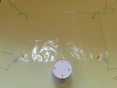 ②ビニールぶくろを裏返し、糸を紙コップの4か所にはります。糸がからまないように気をつけてね。