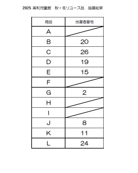 秋・冬リユース抽選結果 美和児童館 2025年10月31日 秋冬リユースの抽選結果をお知らせいたします。 たくさんのご応募ありがとうございました。 当選された方は1週間以内に受け取りに来館してください♪ ※受け取りの際には半券を必ずお持ちください。 またエントリーしたが、当選しなかった方は残りの大型品を優先的に受け取れます。※受け取りの際には半券を必ずお持ちください。