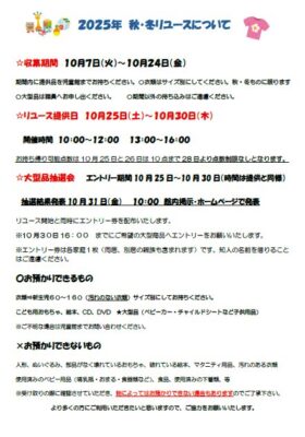 2025 秋・冬リユースについて 美和児童館 2025年10月02日 秋・冬のリユースについてお知らせです! 5月の春・夏リユースに参加していただいた皆さまありがとうございました! 秋・冬のリユース開催方法を5月の春・夏リユースの時より変更します。 詳しい内容は下記の画像をクリックまたはタップしていただきご確認ください。